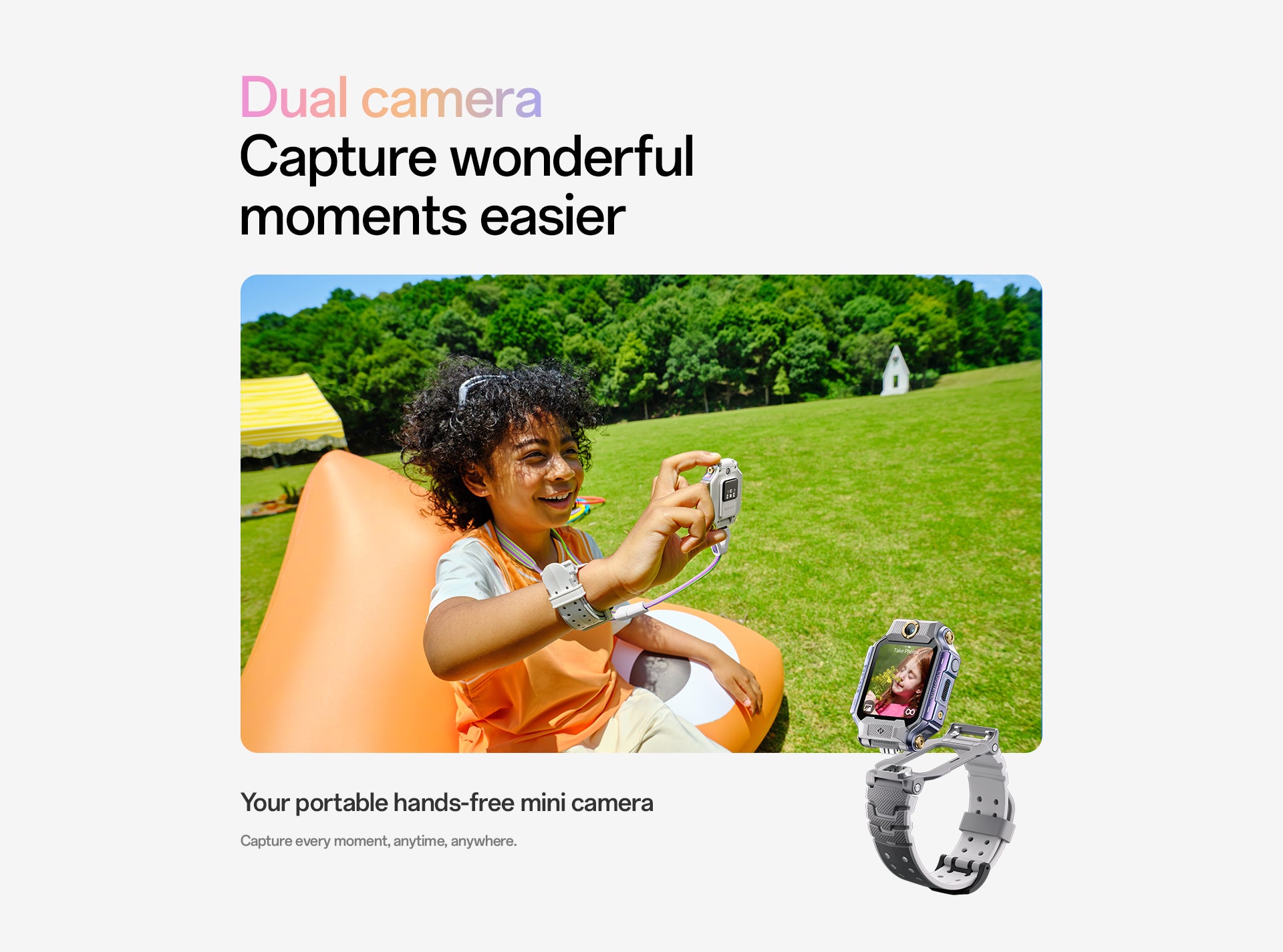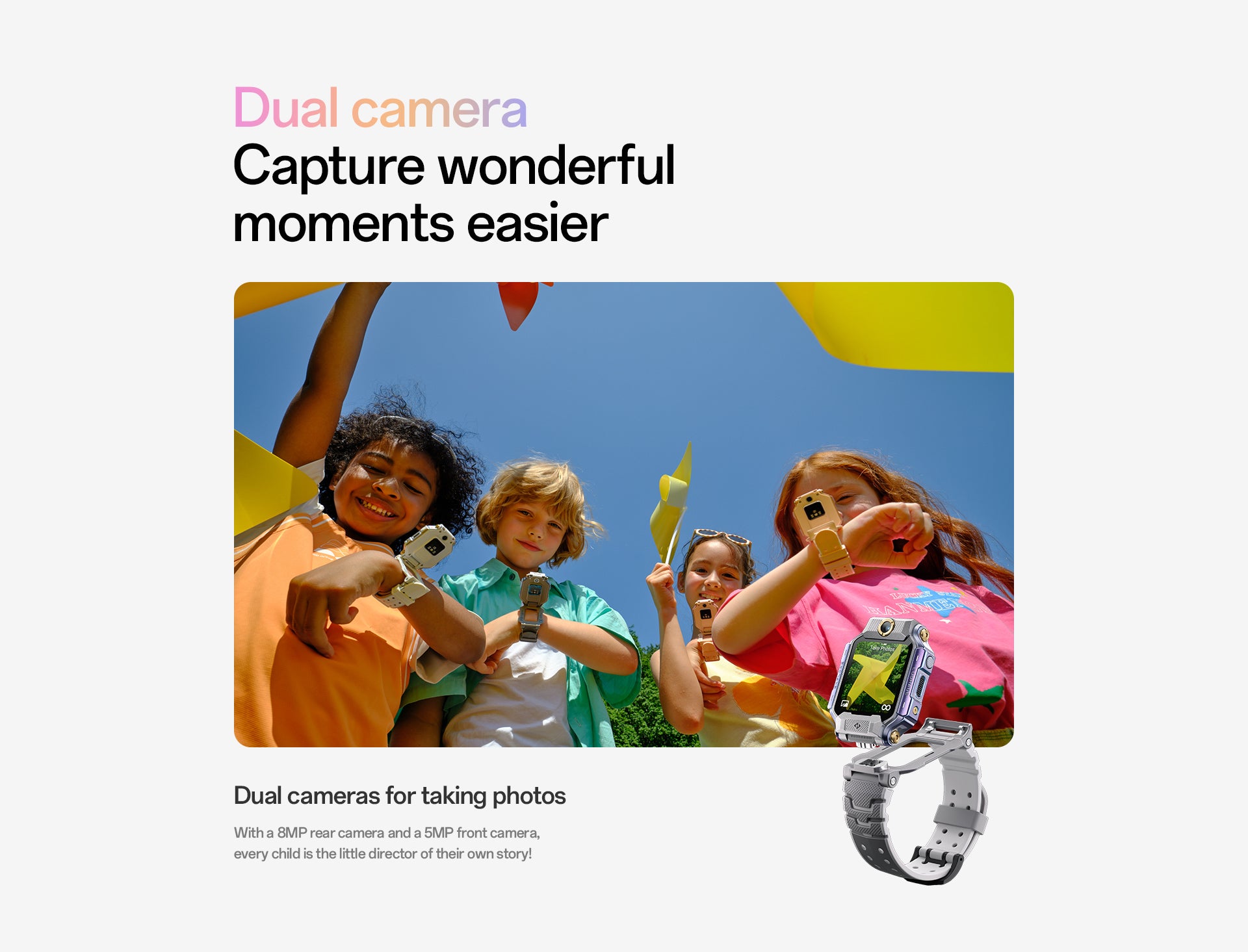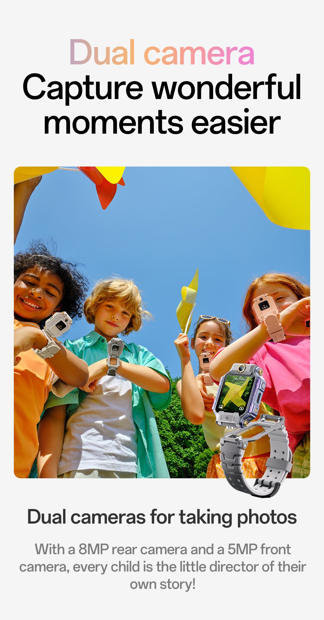1. Flip & Detach Dual Cameras:An innovative 180° flip-and-detach design with front and rear cameras, giving children and parents more ways to connect and explore their surroundings.