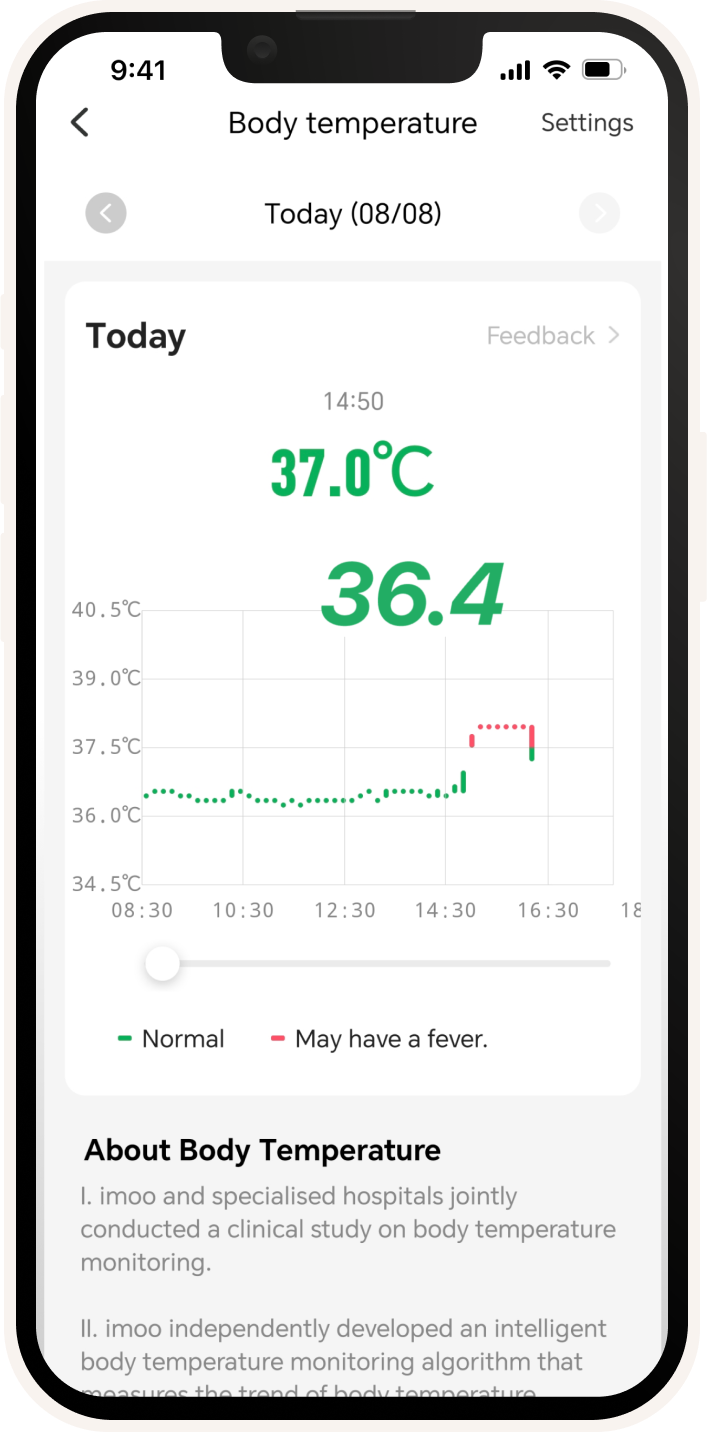 9. Temperature Monitoring: The temperature is measured by continuously monitoring physiological indicators, with a slight delay in measurement. The first measurement may have a slight error. If the temperature remains close to or exceeds 37.5°C for an extended period, it may indicate a high temperature.