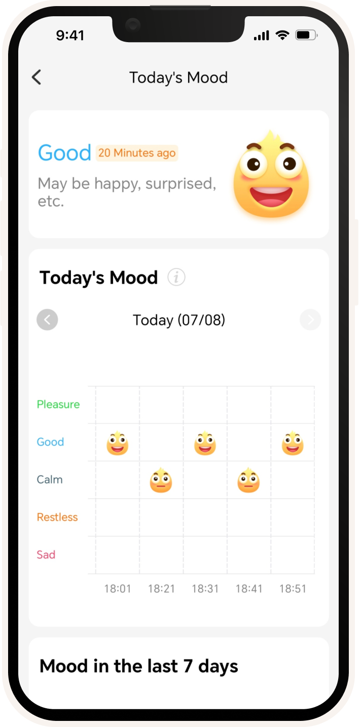 Create deep learning network models based on the user's physiological conditions, changes in heart rhythms, etc.Read your kid's emotions all day long and record their emotional changes throughout the week to help you better understand your kid.